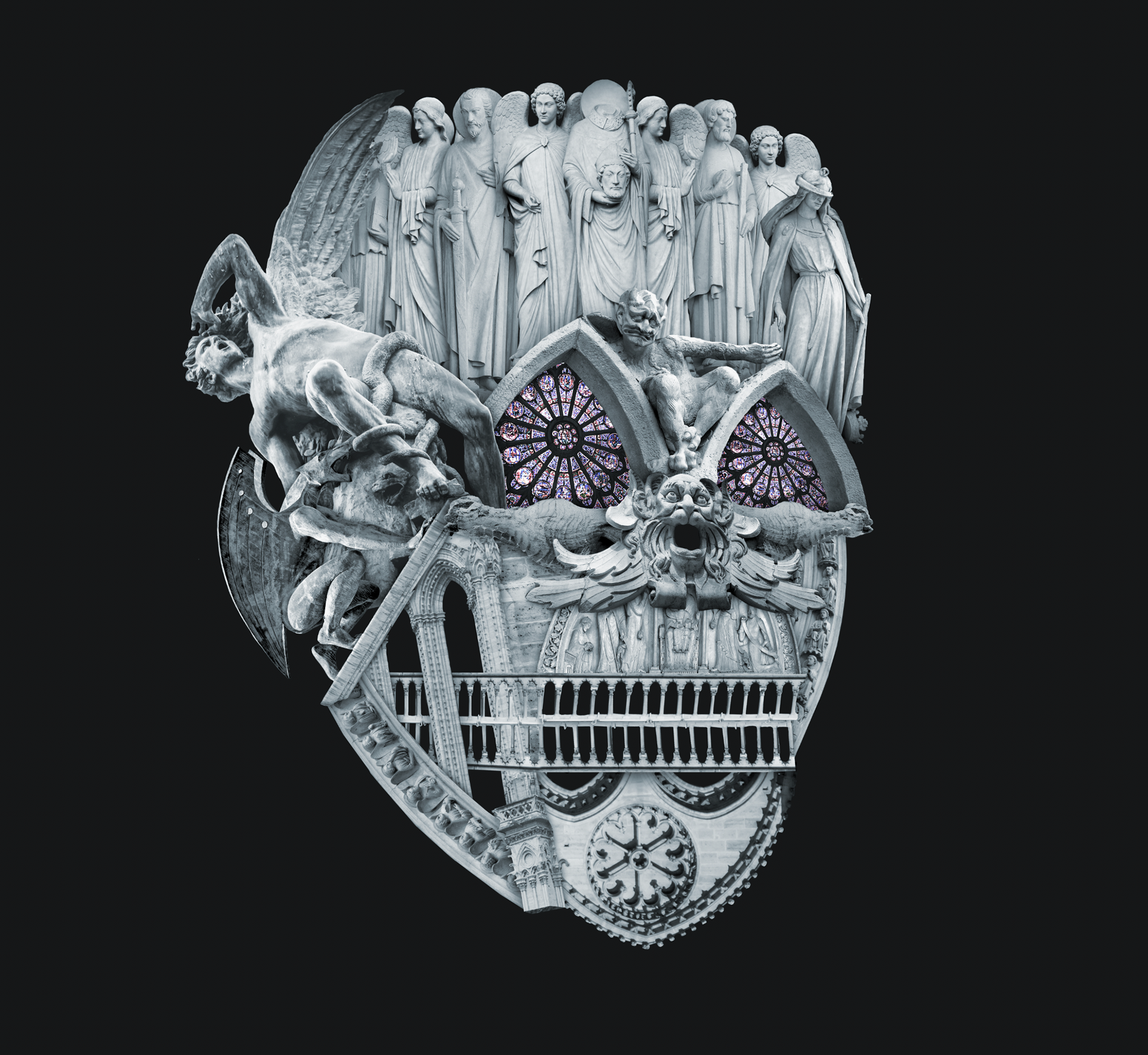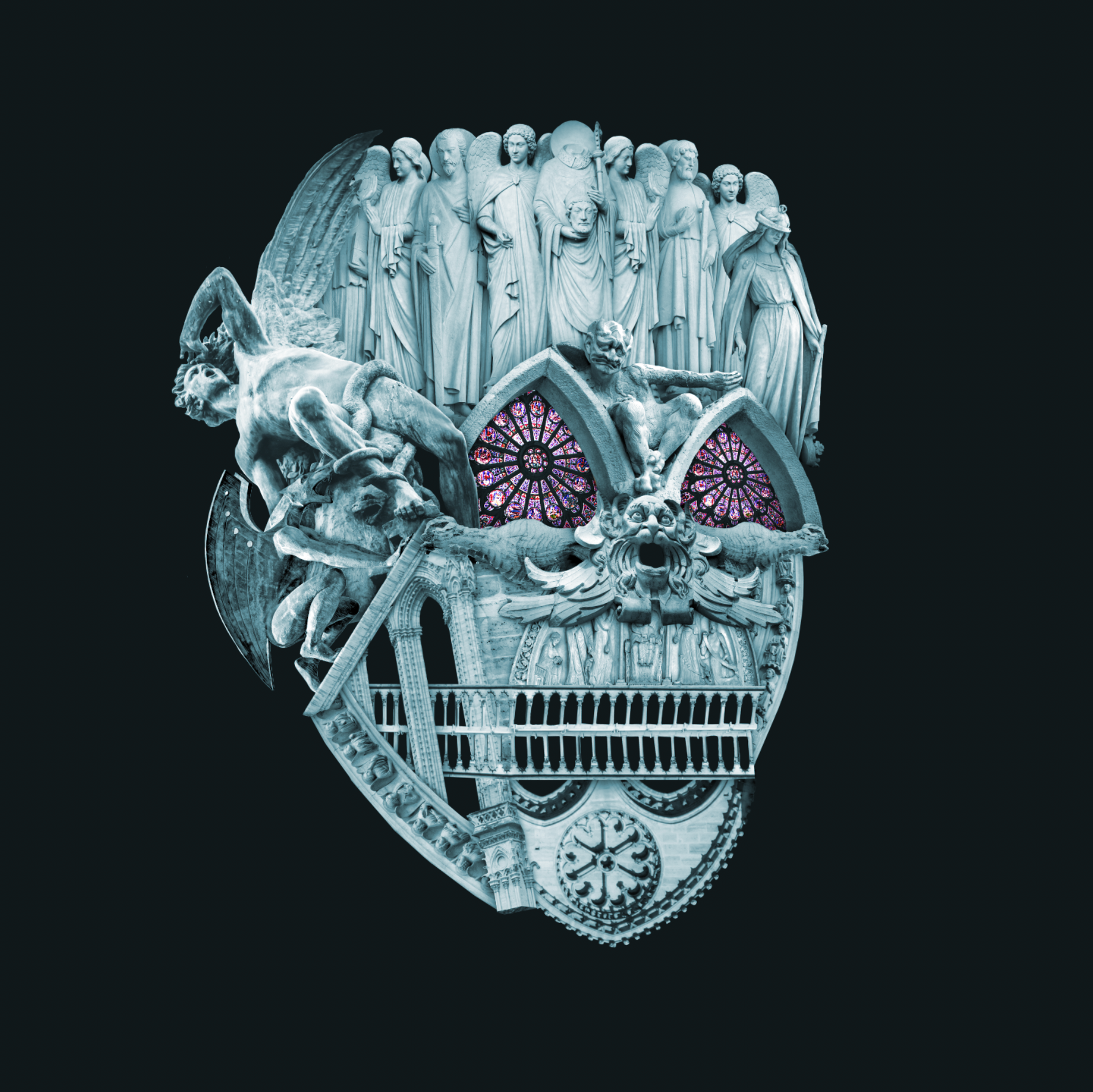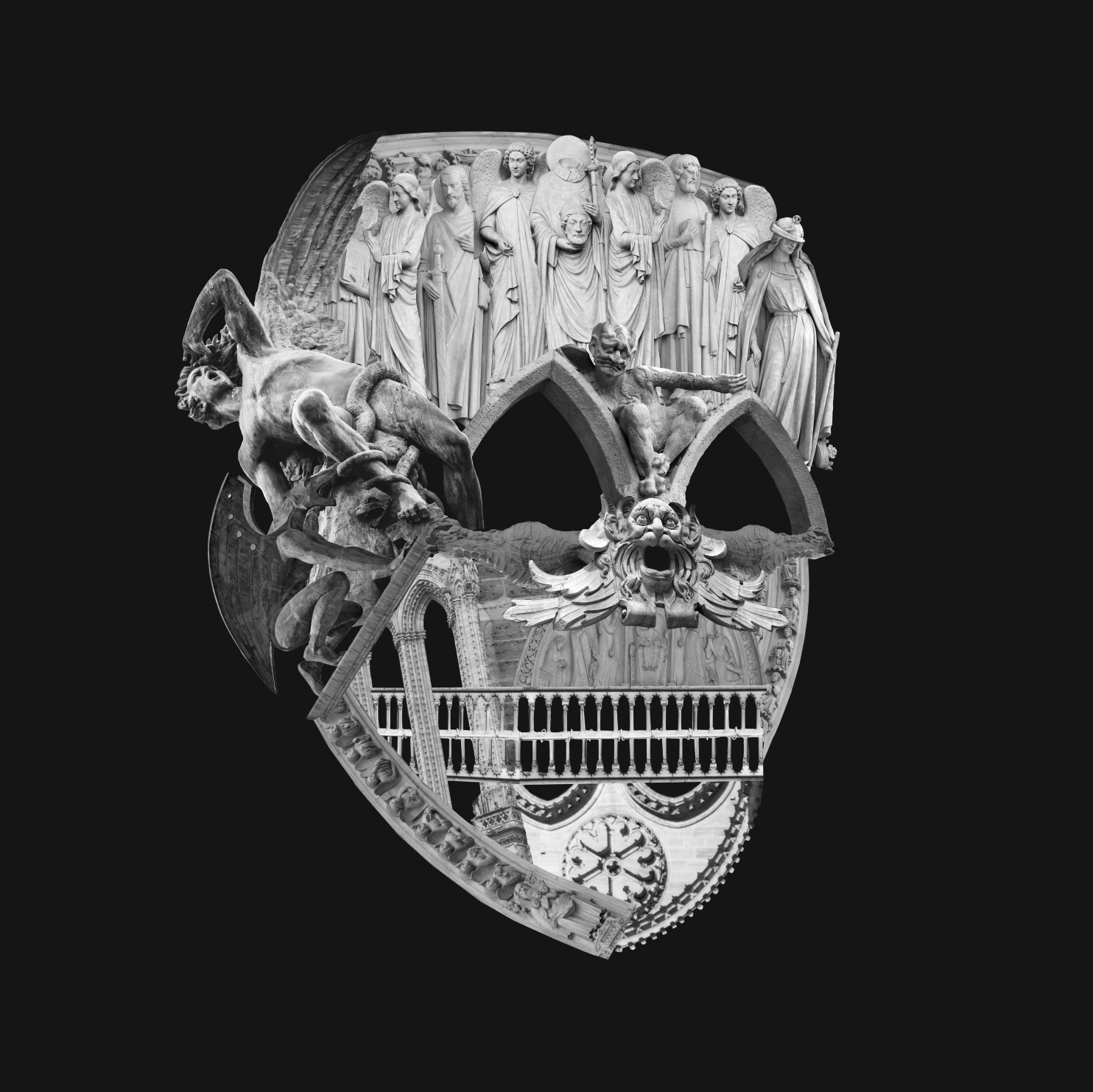 Twisted gargoyles and angelic statues of saints build the image of the human skull, echoing the lyric's question of humanity and morality. The skull is comprised entirely of Gothic architecture, taking most of its pieces from the Notre Dame Cathedral.