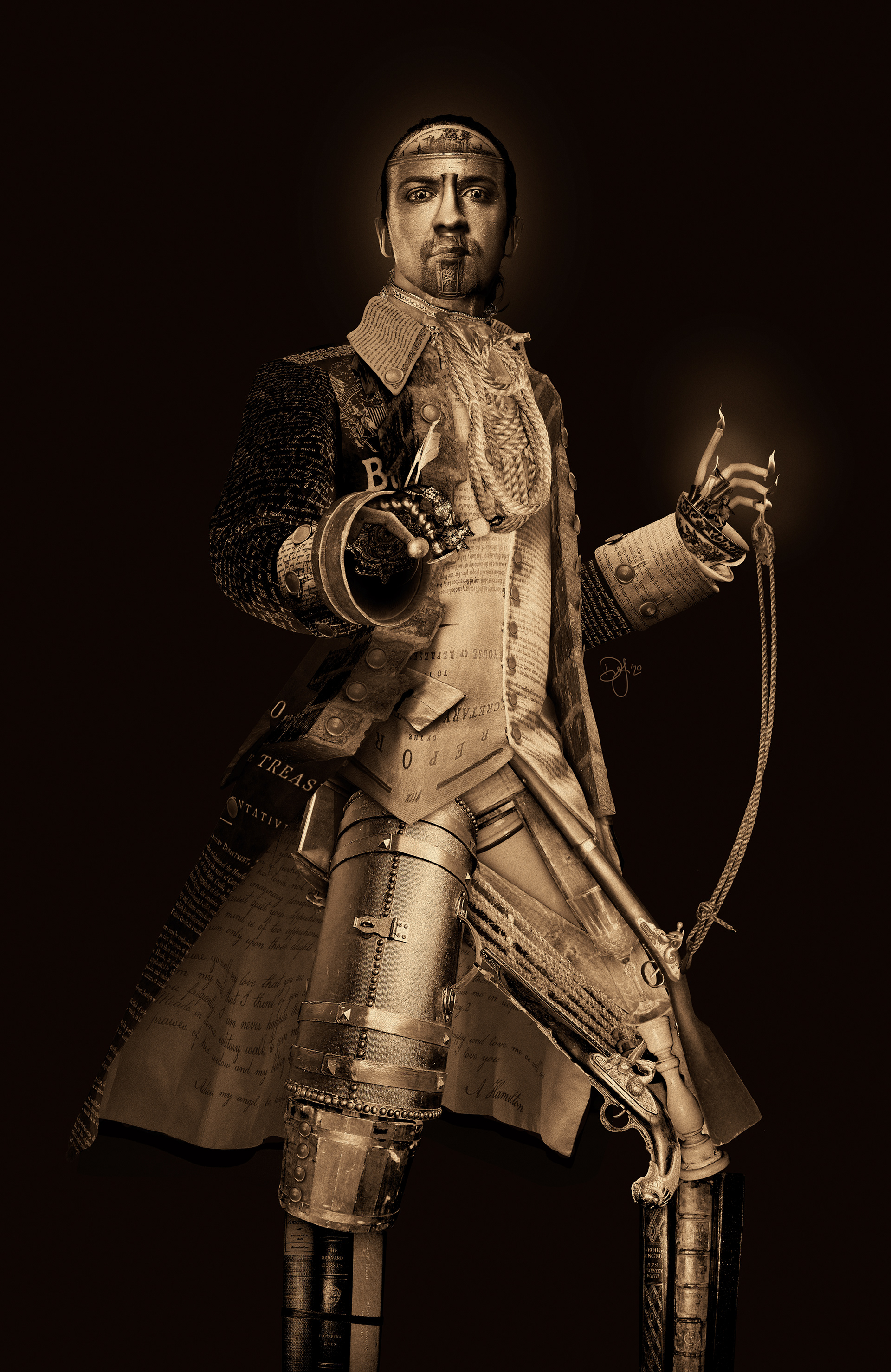 Portrait of Lin-Manuel Miranda comprised of props and set pieces from the original Broadway production of 'Hamilton.'