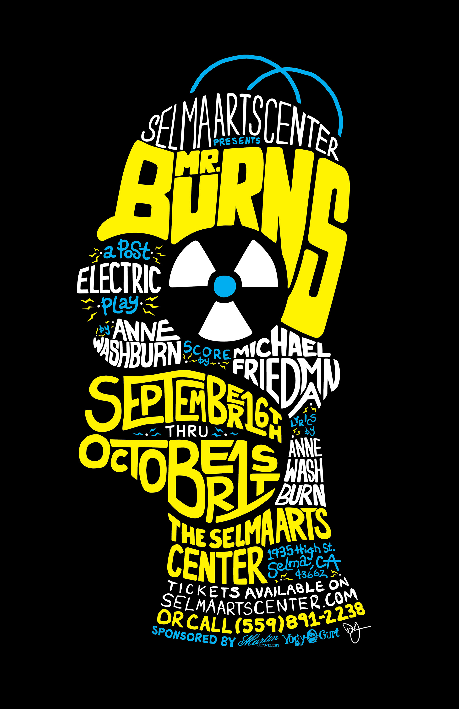 Inspiration was drawn from The Simpsons television series and psychedelic concert posters. The type forms the image of Homer Simpson, his eye taking the shape of a radioactive symbol. Mr. Burns is a very dark comedy with lots of twisted humor. I wanted this poster to feel a little bit deviant in it's mood, taking what you know about The Simpsons and turning it into something a little more off-putting. I used highlighter yellow and electric blue to convey the shocking aspects of the show as well as the theme of it being a "Post-Electric" play.